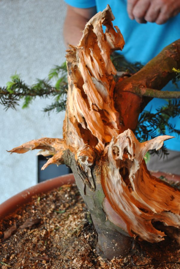 Az elhalt ágként, jin-ként megformált részeket egy gázégővel égette ki, ez egyrészt leégeti a finom "szőröket", másrészt gyorsan kiszárítja a fát, harmadrészt az elkormolódott szín mélységet ad.